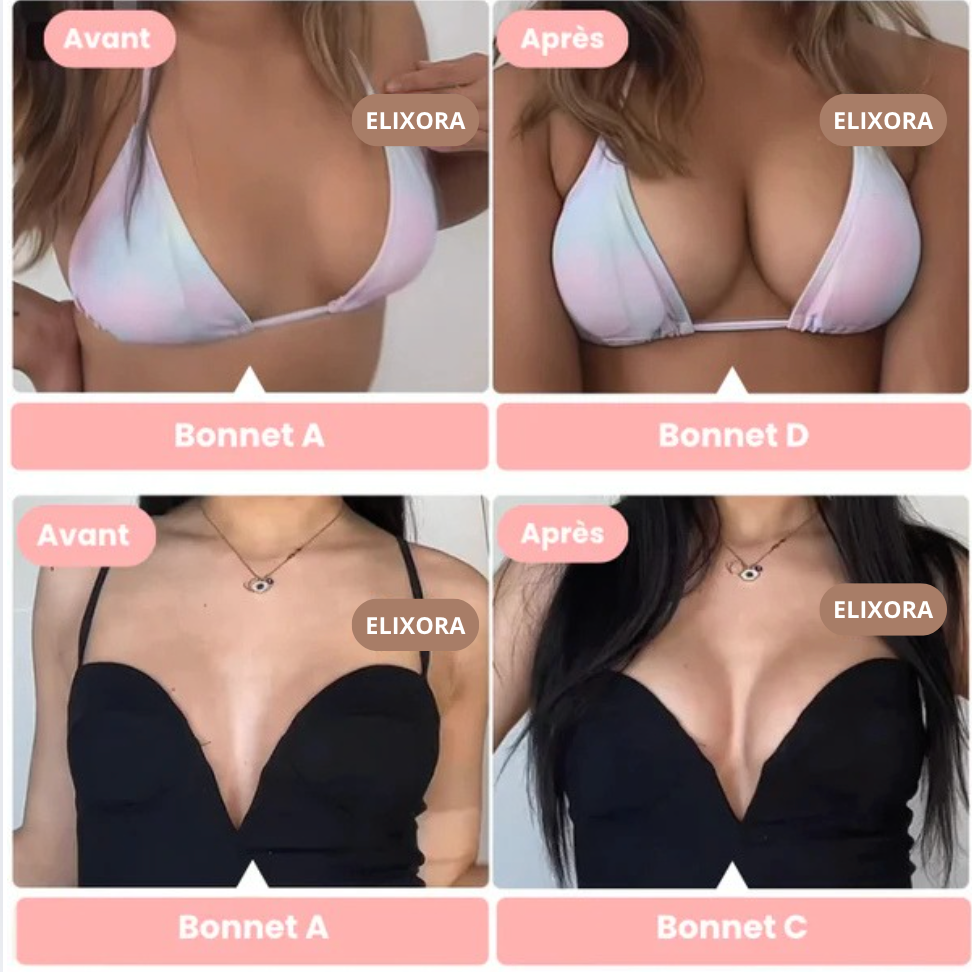 Elixora stimule la circulation sanguine, aide à atténuer les vergetures et prévient l'affaissement pour une poitrine toujours tonique et ferme.